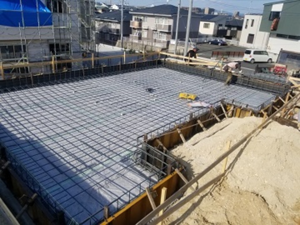 外構工事が順調に進んでいます。本日は駐車場の土間打ち工事です。ワイヤーメッシュを入れることでコンクリートのひび割れ防止をしています。
