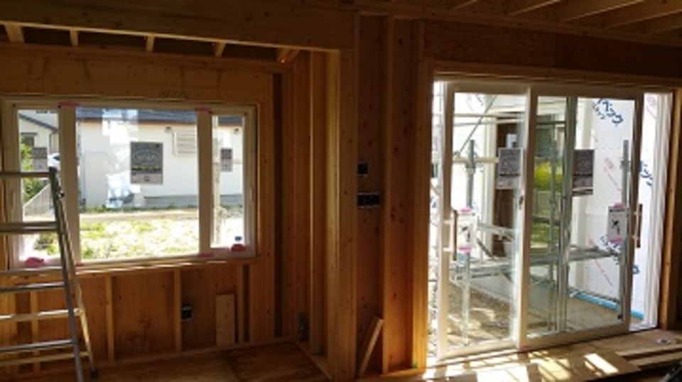 開口部にサッシが取り付けられました。サッシが入ると今まで以上に「室内」という雰囲気を感じます。今回も断熱性能の高いサッシを採用しておりますので、引渡しの時期が夏頃の予定ですが、きっとK様にも涼しい夏を感じて頂けるのではないかと思います。