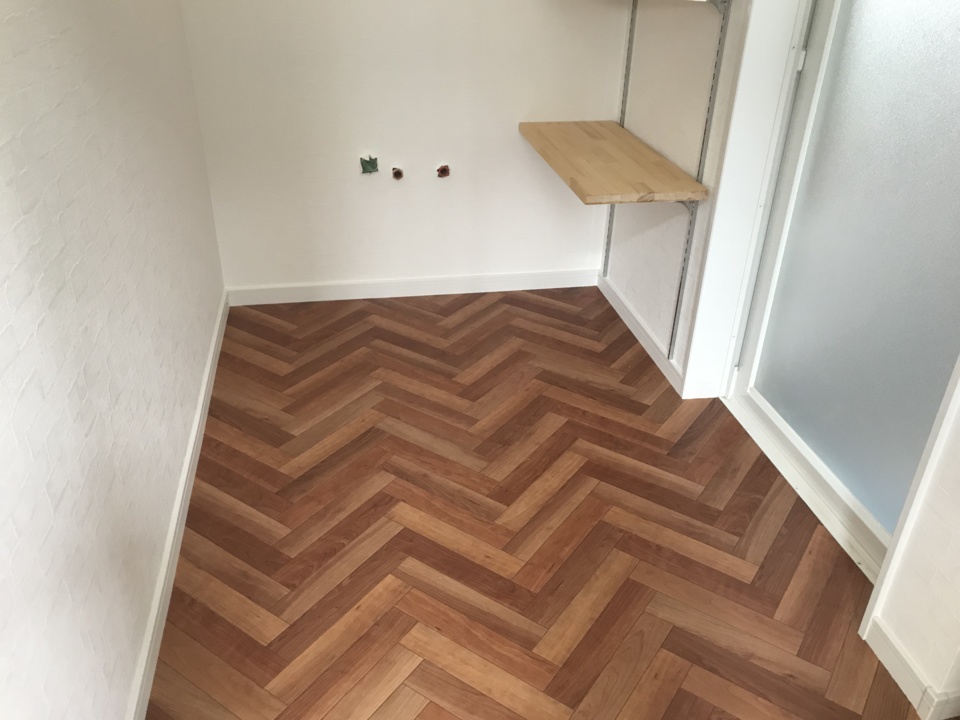 洗面脱衣室のクッションフロアが施工されました。最後まで悩まれましたがとてもいい感じです!洗面台がつくのが楽しみです。