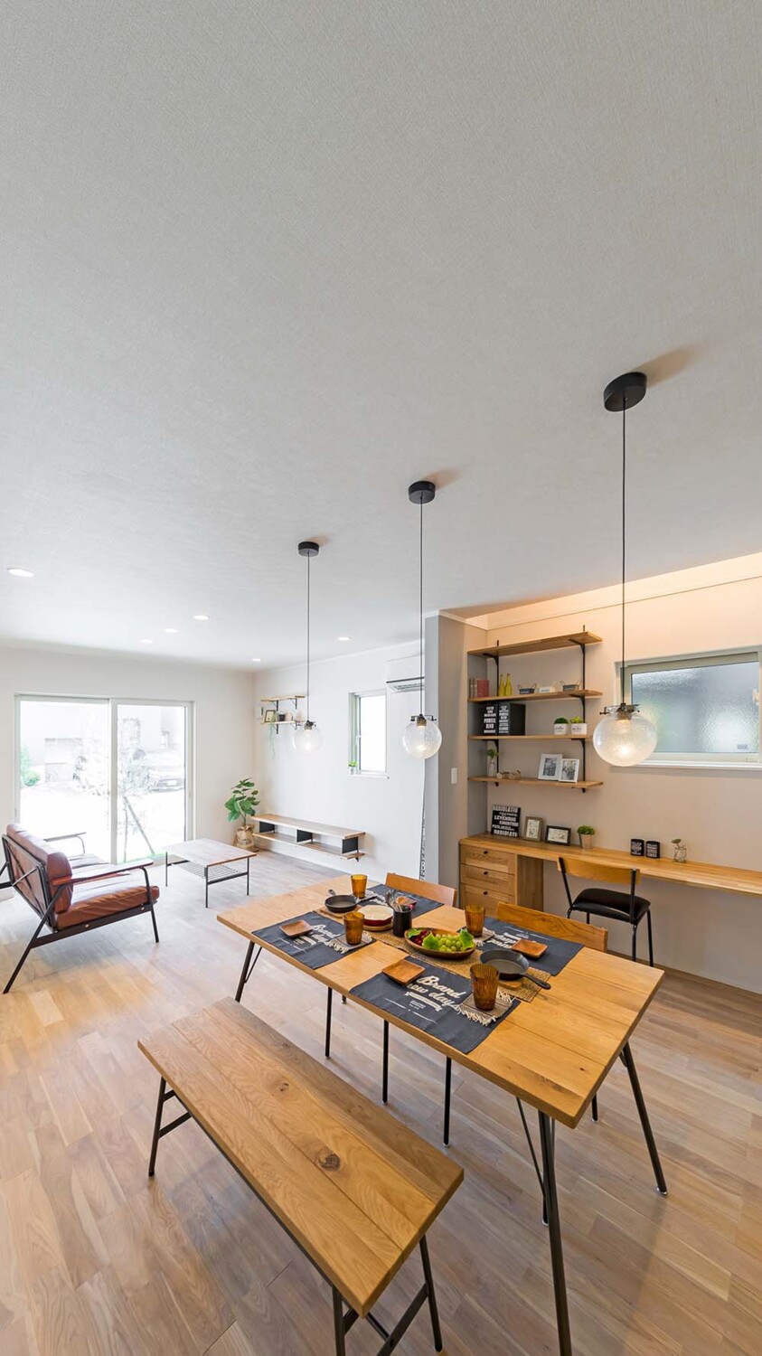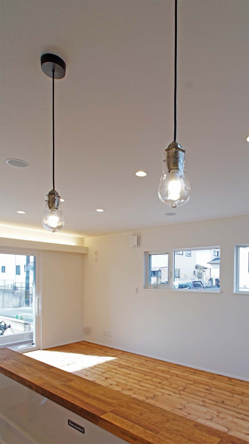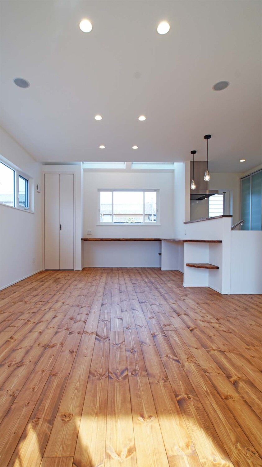 無垢のボルドーパインの床は木目や節もあるので好みが分かれるアイテムです。が、肌触りがよく冷っと感も少ないので、小さいお子さんにもやさしい素材です。ちなみにこの家はドアも無垢、壁は漆喰仕上げです。照明も全てLEDの”調光・調色”ライトコントローラーでシーンに合わせたライティングが可能です。リビングへの引き戸のガラスはおしゃれなチェッカーガラス♪日当たり良好で、とても明るいリビングです。