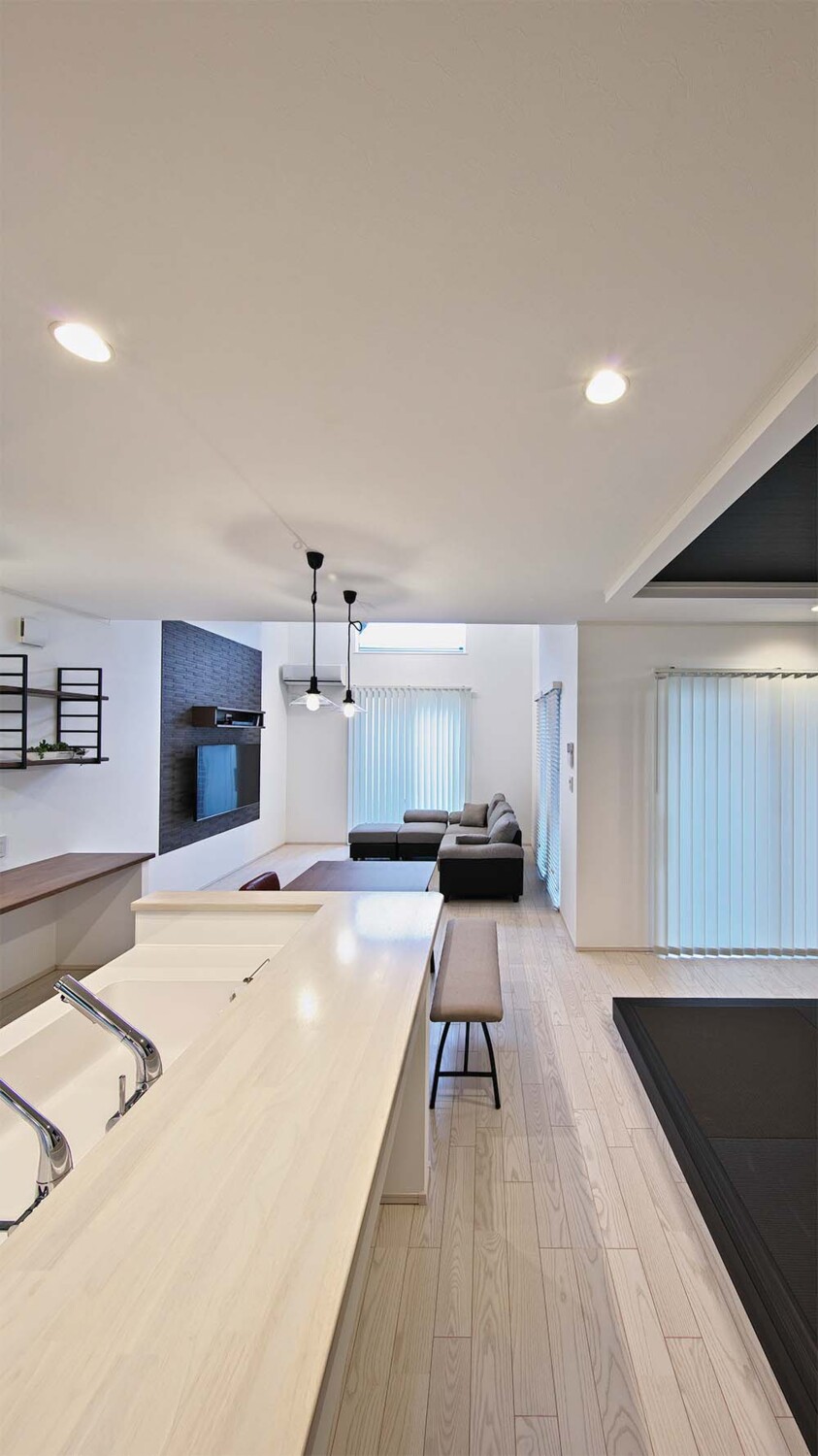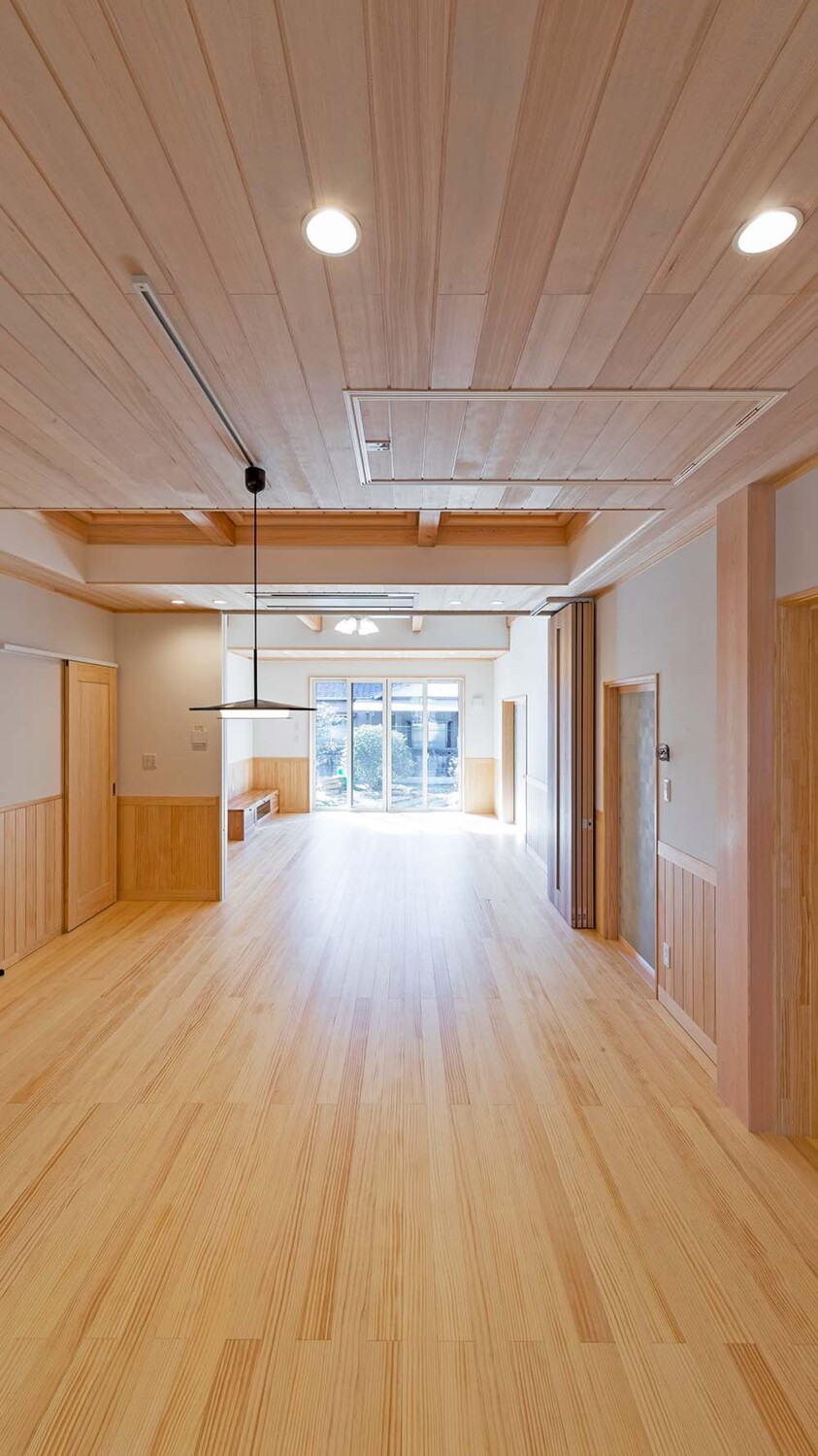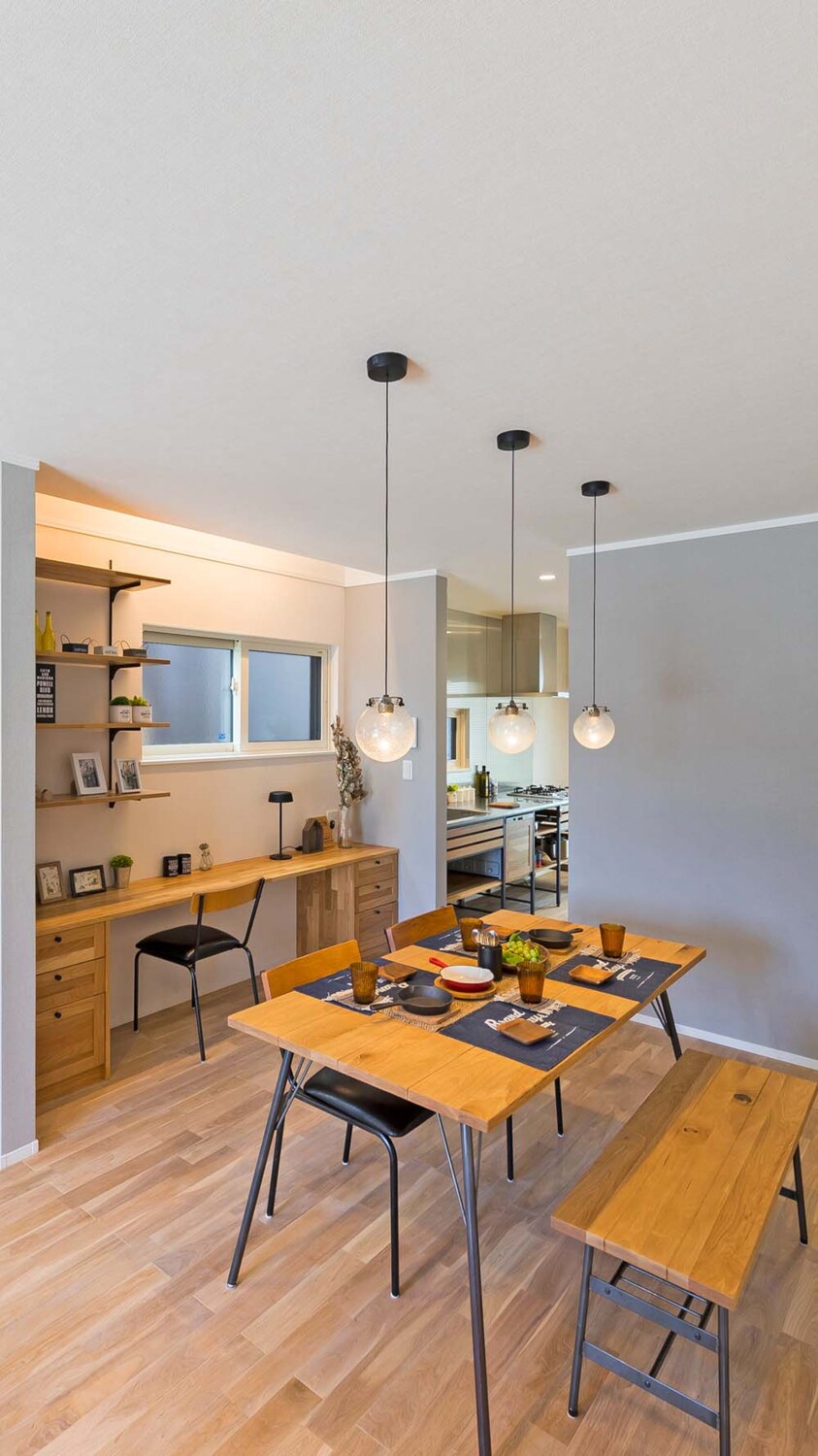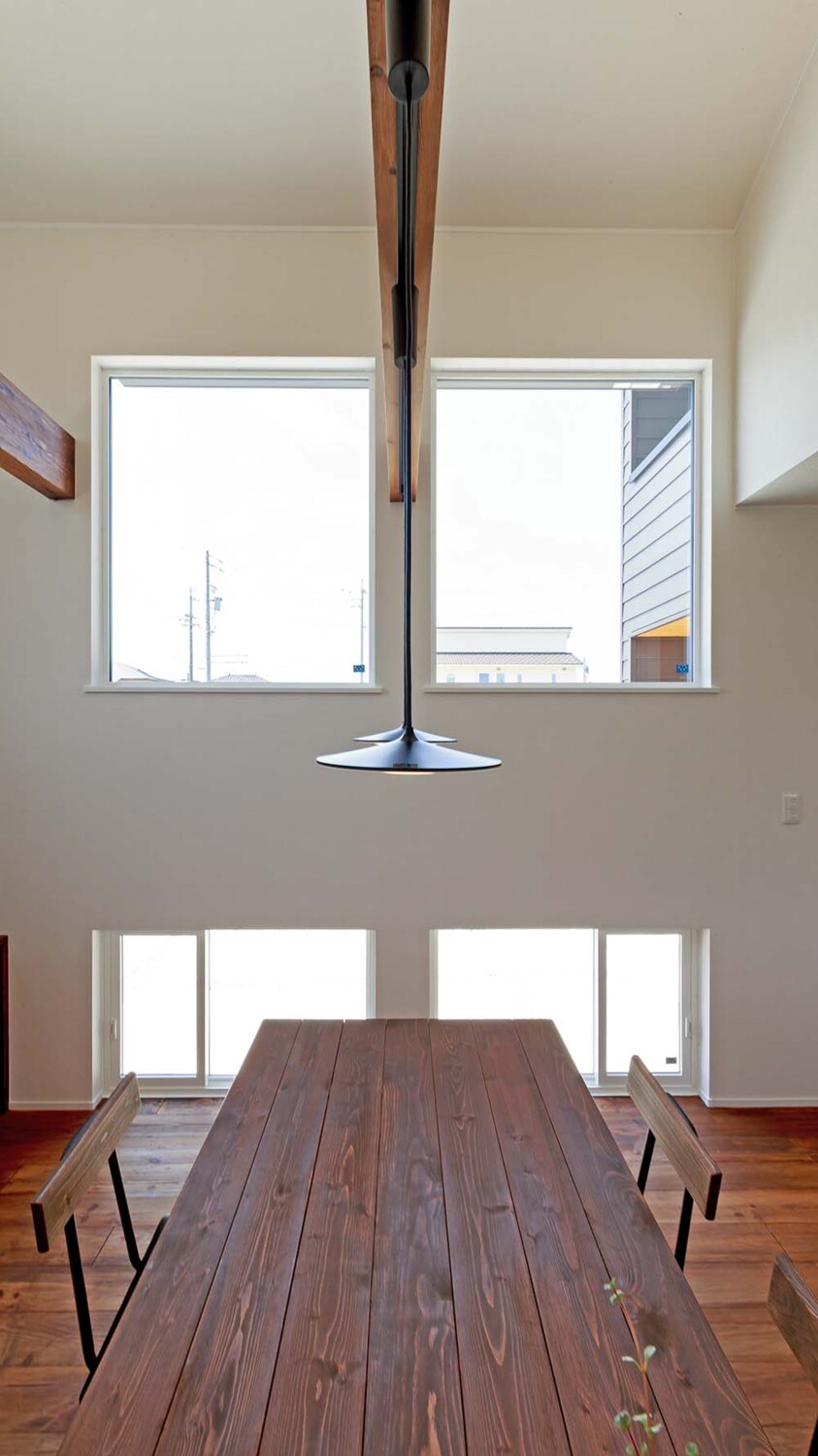 無垢のボルドーパインの床は木目や節もあるので好みが分かれるアイテムです。が、肌触りがよく冷っと感も少ないので、小さいお子さんにもやさしい素材です。ちなみにこの家はドアも無垢、壁は漆喰仕上げです。照明も全てLEDの”調光・調色”ライトコントローラーでシーンに合わせたライティングが可能です。リビングへの引き戸のガラスはおしゃれなチェッカーガラス♪日当たり良好で、とても明るいリビングです。