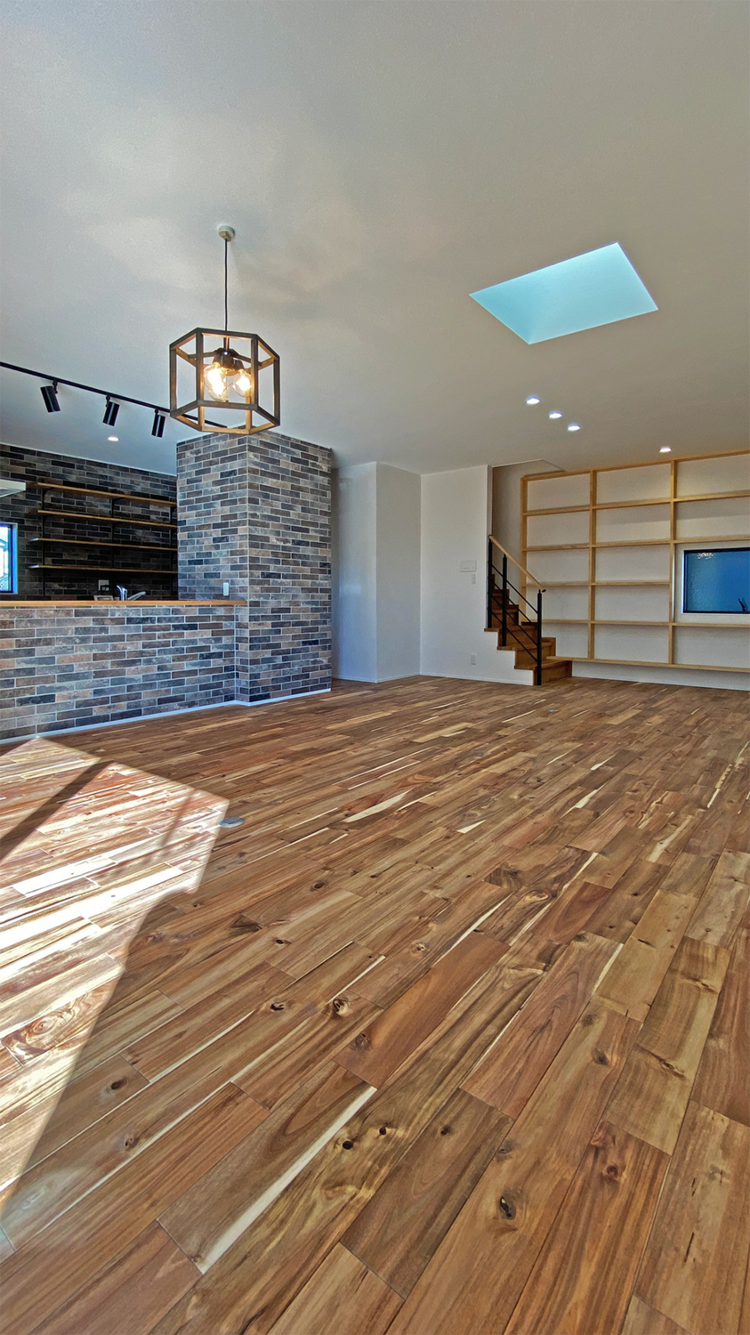 リビングも含め無垢フローリングは「アカシア」をクリアーのオイルフィニッシュで仕上げました。塗装前に比べると色味、木目、節など非常に表情豊かに仕上がりました。好みが分かれるかもしれませんが、ヴィンテージテイストやブルックリンスタイルにはおススメの床です。